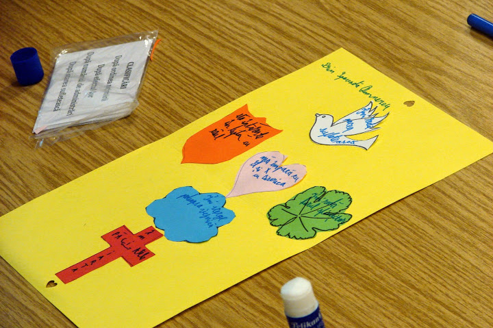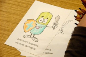Pentru activitatea legată de Spovadă, le-am pregătit imagini de decupat, listate pe hârtii color, pe care să scrie câte un mic text. Imaginile le-au lipit în interiorul unui carton galben îndoit în două, scriind mai înainte sus: „Prin Spovadă, Dumnezeu„. Au aşezat apoi după bunul plac imaginile decupate pe care au scris astfel: