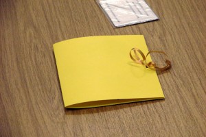 La final am trecut o panglică prin două perforaţii făcute la mijlocul laturilor mici ale cartonului, legându-l astfel ca pe un cadou.