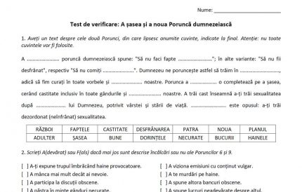 Fişa aceasta poate fi utilă după o lecţie despre Poruncile 6 și 9. Conţinutul testului este inspirat din capitolul „A șasea poruncă dumnezeiască” și capitolul „A noua poruncă dumnezeiască”, din „Abecedarul credinţei. Catehism greco-catolic pentru copii”, apărut la Viaţa Creştină în 2013. Un material de predare se găsește aici.