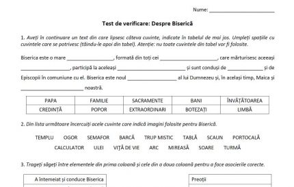Fişa aceasta poate fi utilă după o lecţie despre Biserică. Conţinutul testului este inspirat din capitolul „Despre Biserică”, din „Abecedarul credinţei. Catehism greco-catolic pentru copii”, apărut la Viaţa Creştină în 2013. Un material de predare se găsește aici. O variantă nouă de prezentare a lecției se găsește pe Prima.Cateheza.ro.