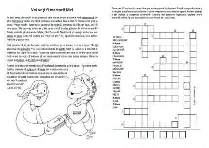 Această fişă (cu desenul © Fano) prezintă textul de la Luca 24,35-48 (Isus vine în mijlocul discipolilor Săi, după Înviere, şi mănâncă cu ei pentru a le arăta că nu este un duh/fantomă), din care au fost alese cincisprezece cuvinte. Ele sunt grupate pe lungime şi trebuie aşezate la locul lor în careul din dreapta. Soluţia este unică (dacă nu se pun cuvintele la întâmplare, ci se porneşte de la cele care au o unică amplasare posibilă). Opt căsuţe sunt îngroşate, iar literele din ele formează un salut folosit de Isus Cristos.