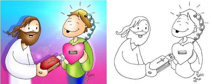 Această fişă (cu desenul © Fano) prezintă textul de la Luca 24,35-48 (Isus vine în mijlocul discipolilor Săi, după Înviere, şi mănâncă cu ei pentru a le arăta că nu este un duh/fantomă), din care au fost alese cincisprezece cuvinte. Ele sunt grupate pe lungime şi trebuie aşezate la locul lor în careul din dreapta. Soluţia este unică (dacă nu se pun cuvintele la întâmplare, ci se porneşte de la cele care au o unică amplasare posibilă). Opt căsuţe sunt îngroşate, iar literele din ele formează un salut folosit de Isus Cristos.
